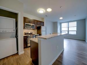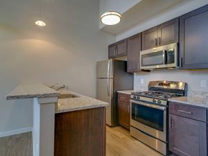 Modern kitchen at College & Crown apartments with stainless steel appliances and quartz countertops.