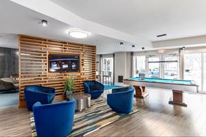 Resident lounge at College & Crown with contemporary seating and community gathering space.