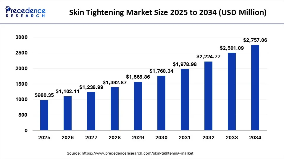 Ottawa, Oct. 30, 2025 (GLOBE NEWSWIRE) -- According to Precedence Research, the global skin tightening market size is expected to be worth over USD 2,757.06 million by 2034, increasing from USD 1,102.11 million in 2026. In terms of CAGR the market is accelerating at a double-digit CAGR of 12.20% from 2025 to 2034. Rising preference for non-invasive surgical procedures, increasing consciousness regarding physical appearance, and increasing healthcare spending in developed regions are driving the growth of the market.