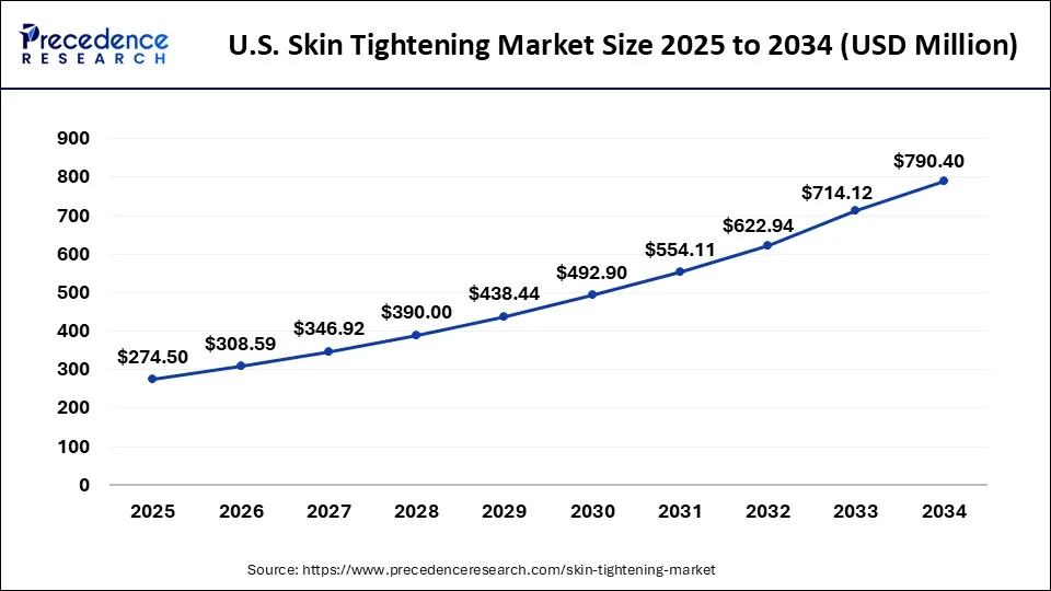According to Precedence Research, the U.S. skin tightening market size is calculated at USD 274.50 million in 2025 and is projected to rise from at USD 308.59 million in 2026 to approximately USD 790.40 billion by 2034, growing at a healthy CAGR of 12.46% from 2025 to 2034.